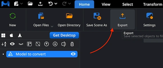When you see that your CTM object is ready for export, find it in the Scene Tree. Right-click the desired object and choose the ‘Export’ button to open the export dialog and prepare for OBJ output.