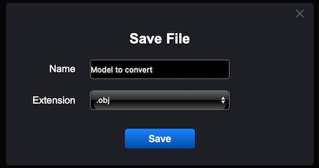 After clicking ’Export,’ the ’Save File’ dialog will appear. Rename your file if needed and open the ’Extension’ dropdown list. Choose .obj as the output format. MeshInspector will then perform the CTM-to-OBJ conversion, preserving mesh structure and topology.