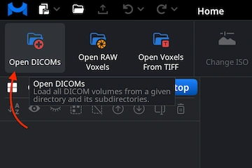 To start the export flow through MeshInspector, click 'Open DICOMs' under the 'CT' (Computed Tomography) tab. This action initiates the process of loading the scan data for your further configuration and potential change.