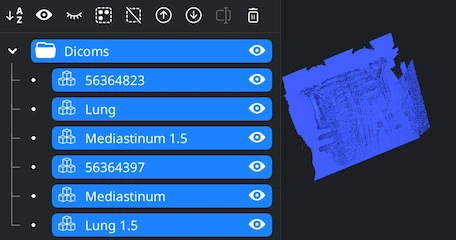 Once the folder is uploaded, MeshInspector displays all detected DICOM series in the Scene Tree. Each series appears as a separate volumetric dataset that you can select by clicking on it or hide using the eye icons. In the Viewport, you will see a raw point cloud representation of the scan. You can navigate the view at any moment. Rotate the view via dragging with the left mouse button or using a one-finger touchpad gesture. Pan it by holding the right mouse button or sliding two fingers on a touchpad. Zoom with the mouse wheel or a pinch gesture. Tilt the view by holding Ctrl while dragging with the left mouse button.