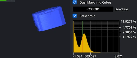 When your TIF represents volumetric data, you can fine-tune which density levels are turned into visible geometry by adjusting the ISO-value. When you click ‘Change ISO,’ under ‘CT’ MeshInspector displays a histogram of voxel intensities. The vertical marker on the histogram corresponds to the current ISO threshold. Click anywhere on the histogram to set a new ISO-value. The 3D preview on the left refreshes in real time. You can also switch between surface extraction algorithms, ‘Dual Marching Cubes’ and ’Standard Marching Cubes.’ Enable ’Ratio scale’ if you want the histogram to be presented regardless of absolute voxel counts.