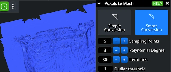When the ISO-value is set, click ’Voxels to Mesh’ to generate a surface model from the volumetric dataset chosen in MeshInspector’s Scene Tree. We offer ’Simple Conversion,’ which produces quick surfaces and ’Smart Conversion’ which applies extra sampling and smoothing for cleaner and more accurate meshes. In ‘Smart Conversion,’ you can adjust such parameters as Sampling Points, Polynomial Degree, Iterations, Outlier Threshold, and the Preparation and Intermediate Smooth values to control how the surface is reconstructed. In case your priority is to keep the voxel object in the scene for comparison, enable ‘Preserve Voxel Object.’ When all the parameters are configured, click ’Convert.’