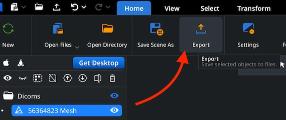 Once the new mesh is generated and selected in the Scene Tree, switch back to MeshInspector’s ’Home’ tab and click ’Export.’
