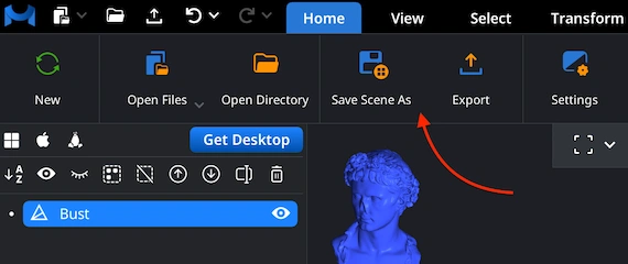 When you are working with the GLTF format, the correct way to convert your PLY file is by using the ‘Save Scene As’ option located under ‘Home’. This method ensures that all data is properly saved in GLTF, unlike the ‘Export’ feature, intended for other formats.