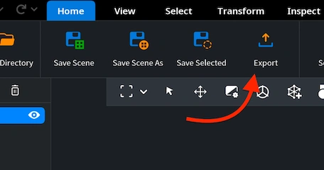 Your next destination point is the ‘Export’ button under the ‘Home’ tab. With your STL model chosen in MeshInspector’s scene tree, click on it.