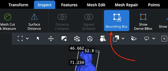 Reopen your freshly generated .ply file in MeshInspector. Go to the ‘Inspect’ tab and click ‘Bounding Box.’ This is how you confirm the model’s physical dimensions and ensure scale consistency.