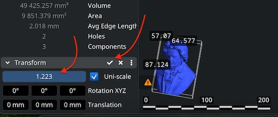 If necessary, adjust your model’s size. In the Scene Tree, find the ‘Transform’ section below 'Information'. Move the scaling slider or type in custom values. Confirm by clicking the checkmark.