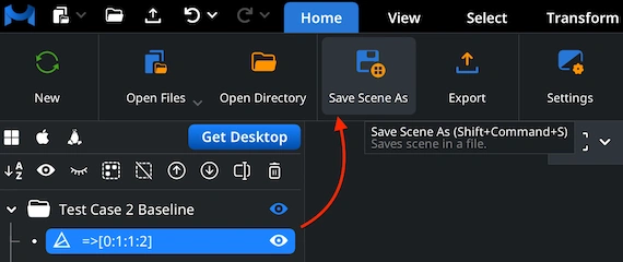 Unlike the standard ‘Export’ command, you should use ‘Save Scene As’ for GLTF output. It is located under the ’Home’ tab, too. We will then export a GLTF scene.