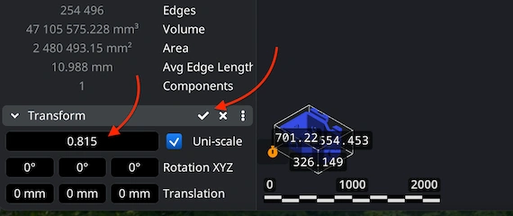 If the GLTF appears to be too small or large, go to the 'Transform' panel. It is located right under ‘Information.’ Move the Scale slider to modify its proportions and volume. When the geometry looks adequate, apply the adjustment by clicking the checkmark icon. This ensures your GLTF model aligns with the required dimensions.