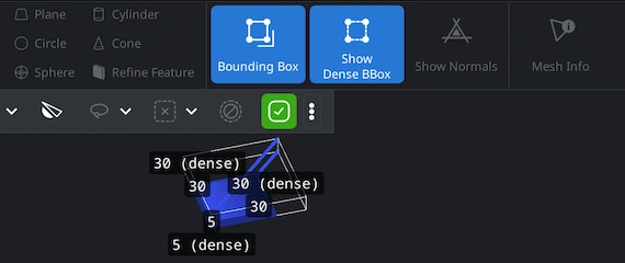 Under the ’Inspect’ tab, you can press ’Bounding Box’ or ’Show Dense Box’ to view the physical dimensions of your toolpath. ‘Bounding Box’ displays an axis-aligned box that encloses the selected object. It gives you a quick and clean understanding of your model’s outer limits. ‘Show Dense Box’ reveals the minimal bounding box that tightly wraps the object. This easily accessible option is useful when the print contains angled geometry, overhangs, or tilted paths.