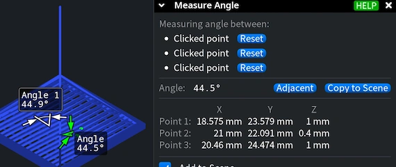 MeshInspector allows you to inspect individual features of a GCODE toolpath with precision. To measure an angle, open the ’Measure Angle’ tool from the ’Inspect’ tab. Click three points directly on the toolpath. As soon as you place the third point, the MeshInspector program to read GCODE files quickly calculates the angle and displays it both in the viewport and in the measurement panel, which is convenient when you need to double-check and validate anything of importance to you.