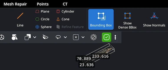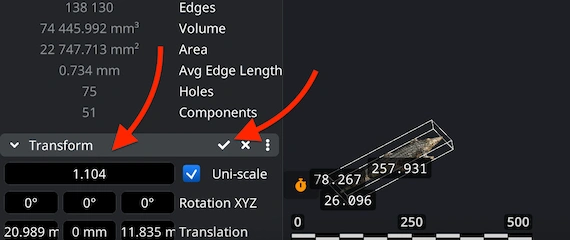 If your GLTF project needs resizing, go to the ’Transform’ panel in the lower-left corner. There, adjust the Scale slider. After choosing the desired value, apply the transformation by clicking the checkmark icon. The scene updates immediately, i.e., the bounding box and volume values are recalculated accordingly.