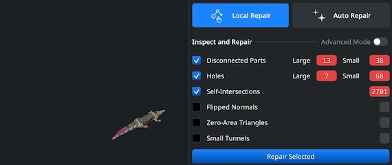 Make use of the ‘Local Repair’ tool to inspect the model for specific problems, for example, fragmented surfaces, disconnected components, or other issues. Enable the checks you need and let the tool process the mesh. Alternatively, ‘Auto Repair’ will attempt to automatically reconstruct your geometry.