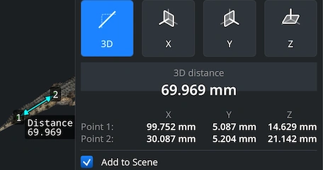 Finally, in order to perform quick distance evaluations within your GLTF scene, open the ‘Inspect’ tab and activate ’Measure Distance.’ Click any points on the model to obtain the exact 3D measurement (also, measuring along X, Y, and Z is possible).