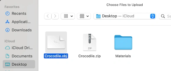Browse to the directory where your OBJ file is stored. Double-click it or confirm the selection with ’Upload.’ We can accept OBJ files both as standalone meshes and as complete archived project folders, including their relevant assets packaged in a ZIP folder.