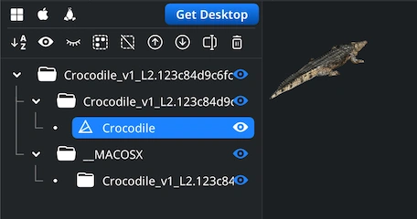 Let’s assume we have uploaded an entire ZIP package containing the OBJ mesh and its supporting elements. After import, the full project structure appears in the Scene Tree. You can now freely explore the OBJ, e.g., rotate the view by dragging with the left mouse button or using a single-finger touchpad gesture. Pan with the right mouse button or two-finger movement. Zoom with the mouse wheel or a pinch gesture. Tilt the perspective by holding Ctrl while dragging with the left button.