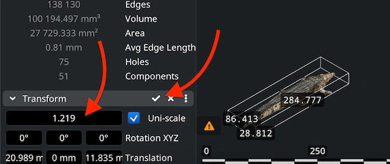 If you need to resize your OBJ model for some reason, use the Scale slider in the ’Transform’ section of the lower-left panel. Select the scaling ratio. After that, apply the change by clicking the checkmark icon. The OBJ mesh will be updated instantly, including its bounding box values as well as volume.