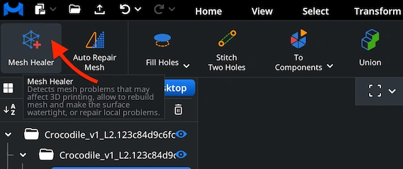 Mesh files represent polygonal geometry. As such, they might contain holes, flipped normals, disconnected islands, or other defects. To examine mesh quality quickly and with ease, open ‘Mesh Healer’ under ‘Mesh Repair.’ This tool analyzes your OBJ and highlights potential issues.