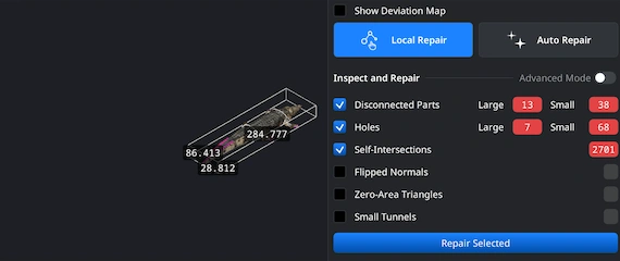 Use the ’Local Repair’ option to check for specific defects, such as holes, non-manifold edges, or self-intersections. Activate the options you need and run the repair to achieve the level of quality you require. Also, the ’Auto Repair’ option will attempt to simply rebuild a problematic mesh.