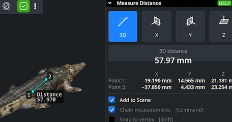 To measure distances, go to ’Inspect’ and enable ’Measure Distance.’ Then click your points on the model. MeshInspector calculates the exact 3D distance and also shows X, Y, and Z projections. This might be useful for quick dimensional checks and validation.