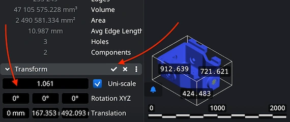 Resize the STL using the scaling bar under ‘Transform’ in the lower-left corner if needed. We handle models of any size. Do not forget to finalize the process by clicking the checkmark. You will see how the model’s volume changes accordingly, as well.