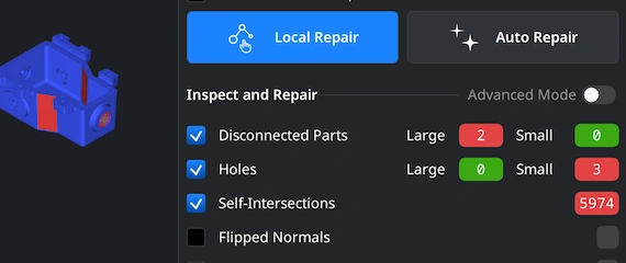 ‘Local Repair’ detects disconnected parts, holes, self-intersections, etc. For printability, you can enable ‘Thin walls’ and ‘Undercuts.’ Select which issues to analyze using checkboxes and then run the repair with a single click. ‘Auto Repair,’ when chosen, will repair the model by totally rebuilding it.