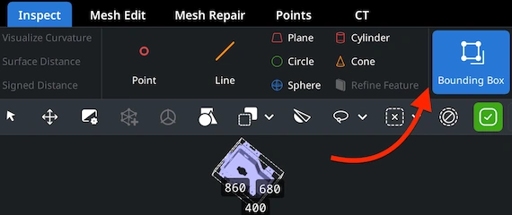 To quickly inspect the size of your STP model, go to the ’Inspect’ tab to enable ‘Bounding Box,’ with the mesh selected in our Scene Tree. This will display the model’s overall dimensions and help you verify its scale before exporting or processing it.