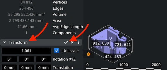 Need to adjust the size of your STP? Use the Scale slider under ‘Transform,’ located in the lower-left panel. After selecting the value, apply the change by clicking the checkmark icon. The model’s dimensions will update instantly, together with its volume.