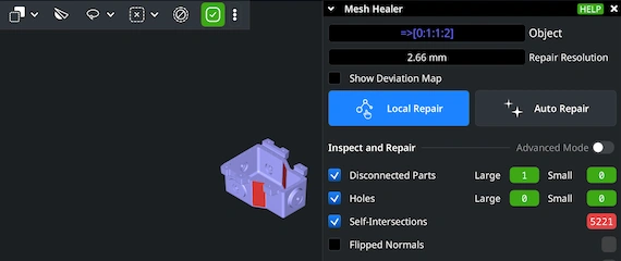 Use ‘Local Repair’ to detect various issues, e.g., holes and disconnected parts. Enable specific checks using the checkboxes, then run the repair. If you choose ‘Auto Repair’, MeshInspector will attempt to fix the model by rebuilding the geometry.