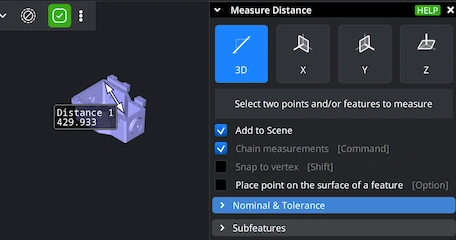 In order to measure distances in your STP model, open ‘Inspect,’ then enable ‘Measure Distance’. After that, click on the points of interest on the surface. MeshInspector will calculate the full 3D distance, along with the X, Y, and Z projections. This feature is helpful when you need precise dimensional checks.
